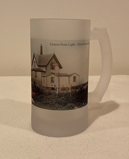 Colorful Frosted Glass Beer Mug of Eastern Point Light in Gloucester, MA