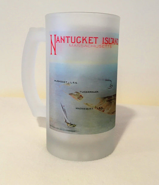 Colorful Frosted Glass Set of (4) Mugs Featuring 19th Century Illustration of The Island of Nantucket.