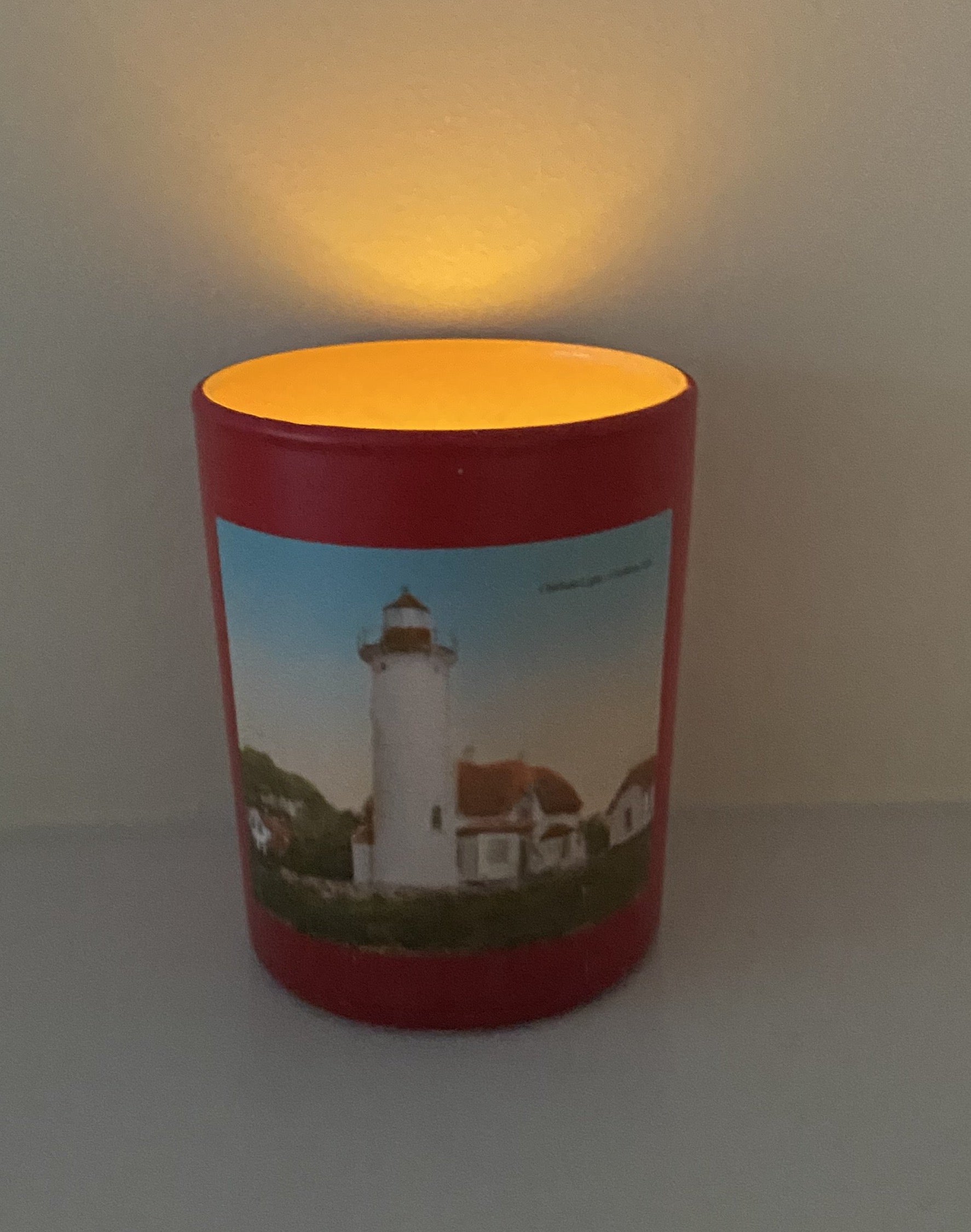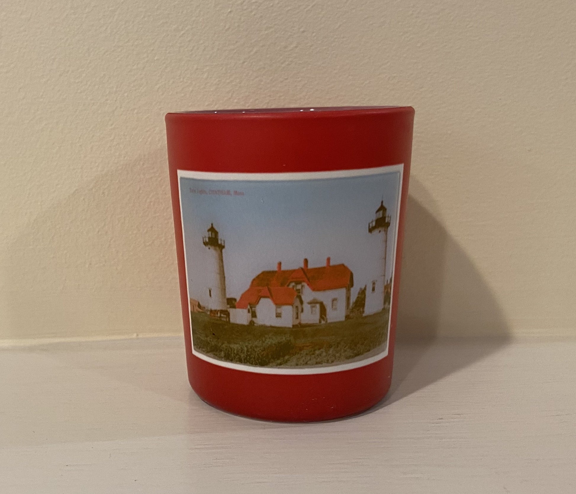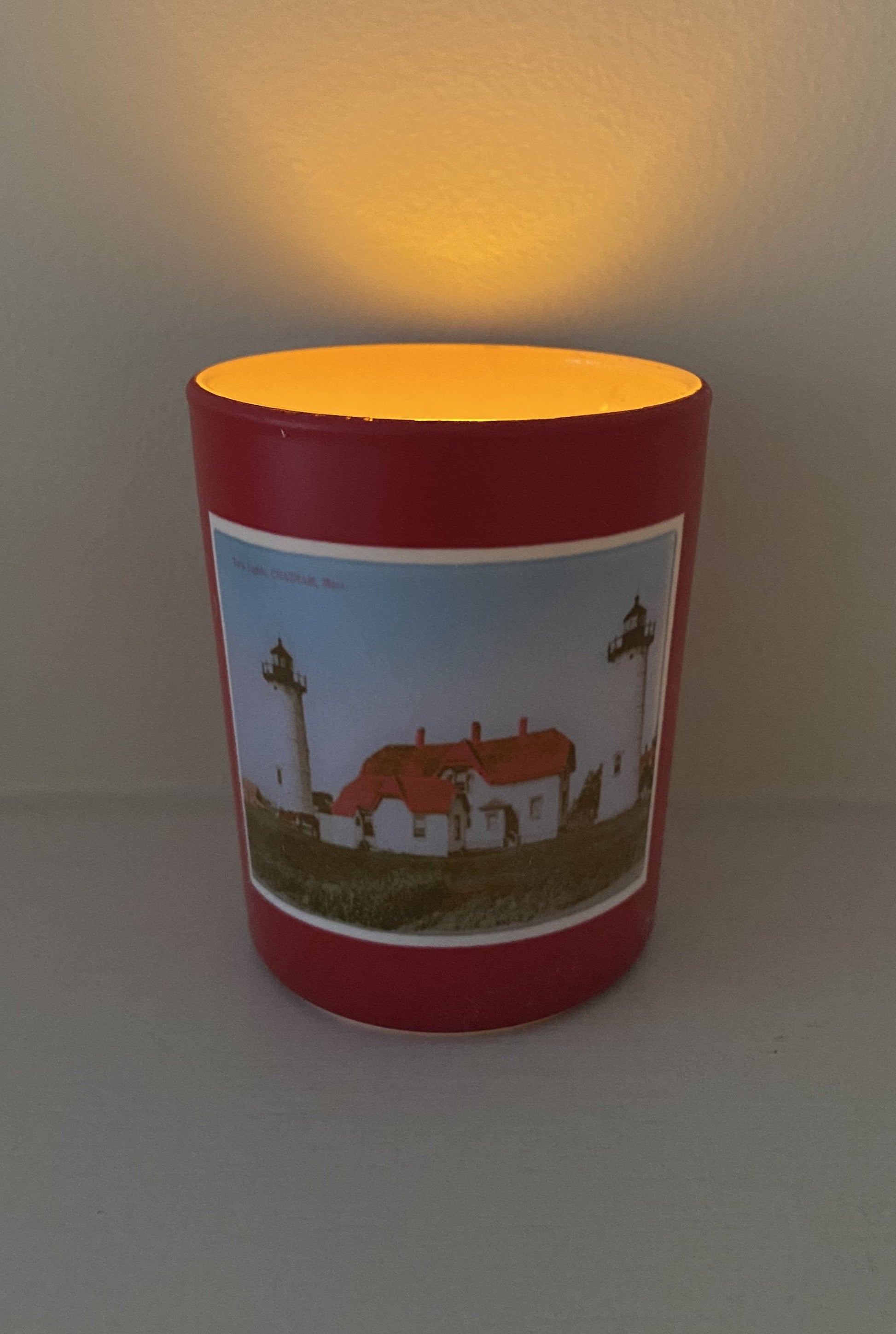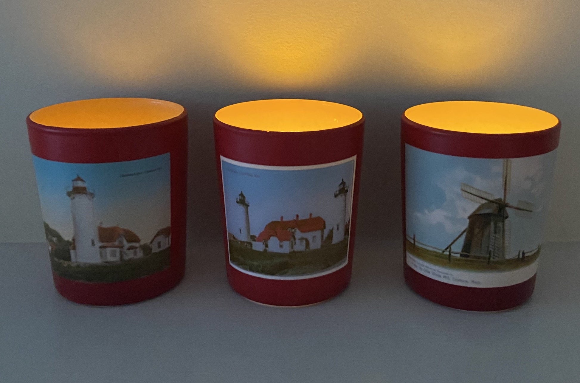 This glass tea light candle holder set features archival hand tinted postcard images of The Twin Lights of Chatham, Chatham Light and the town's iconic Wind Mill. Each is 2.75 inches high and is handmade in The UK. Whether lit with a real or electric tea light candle (as shown here) or unlit, it's a wonderful lighthouse design element or Cape Cod summer memento. They're sold in sets of 3 and arrive within 5-7 business days.
