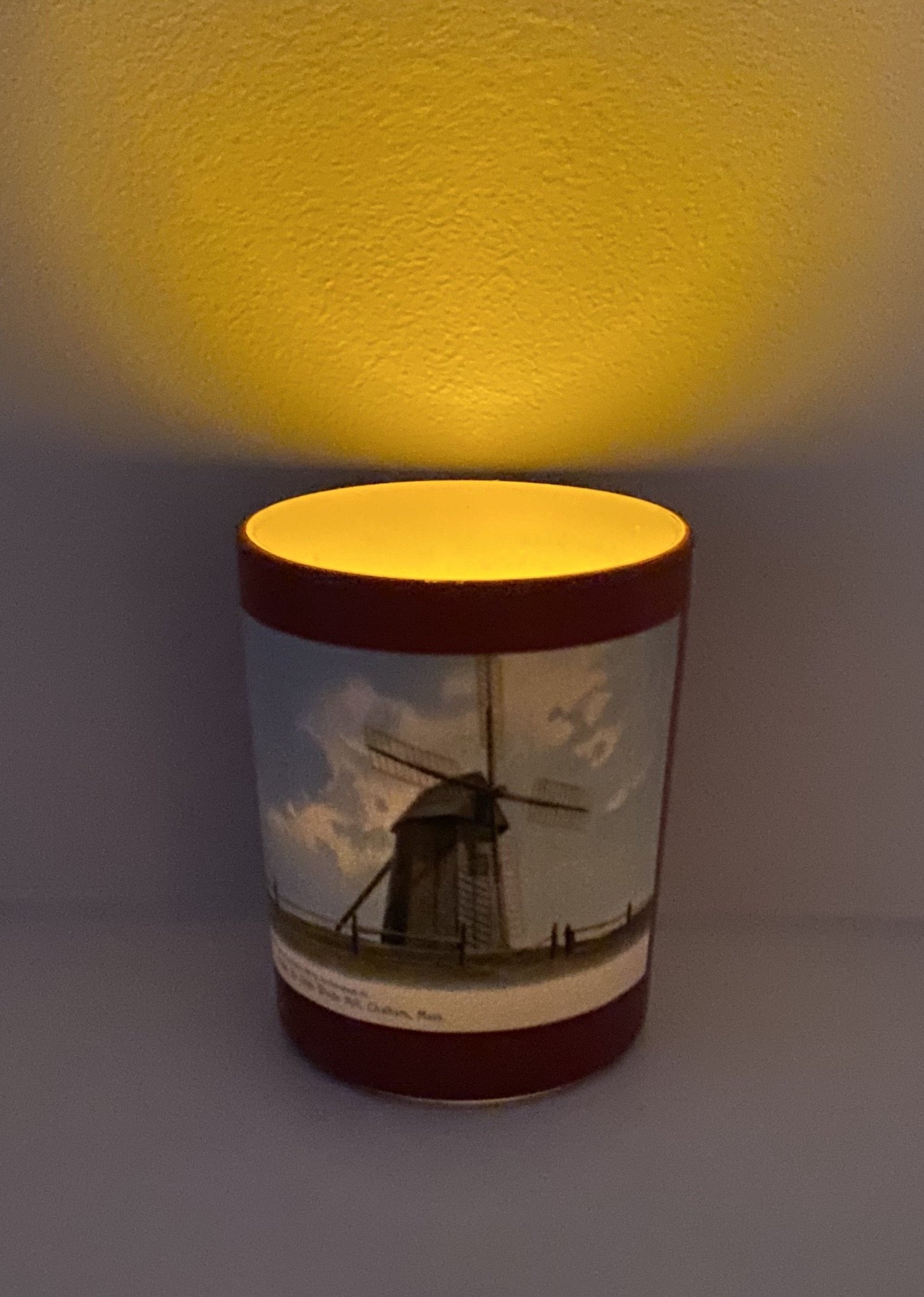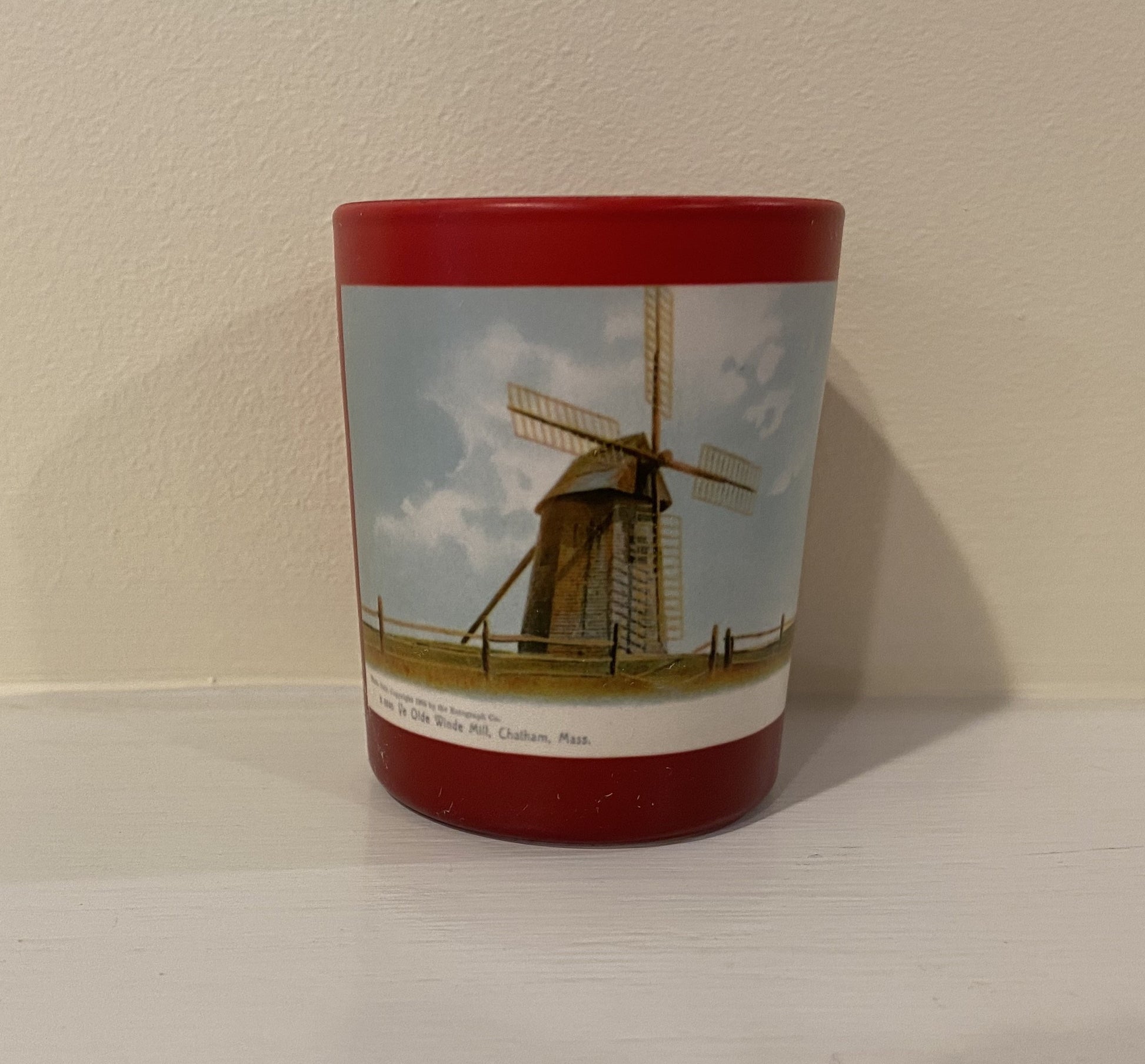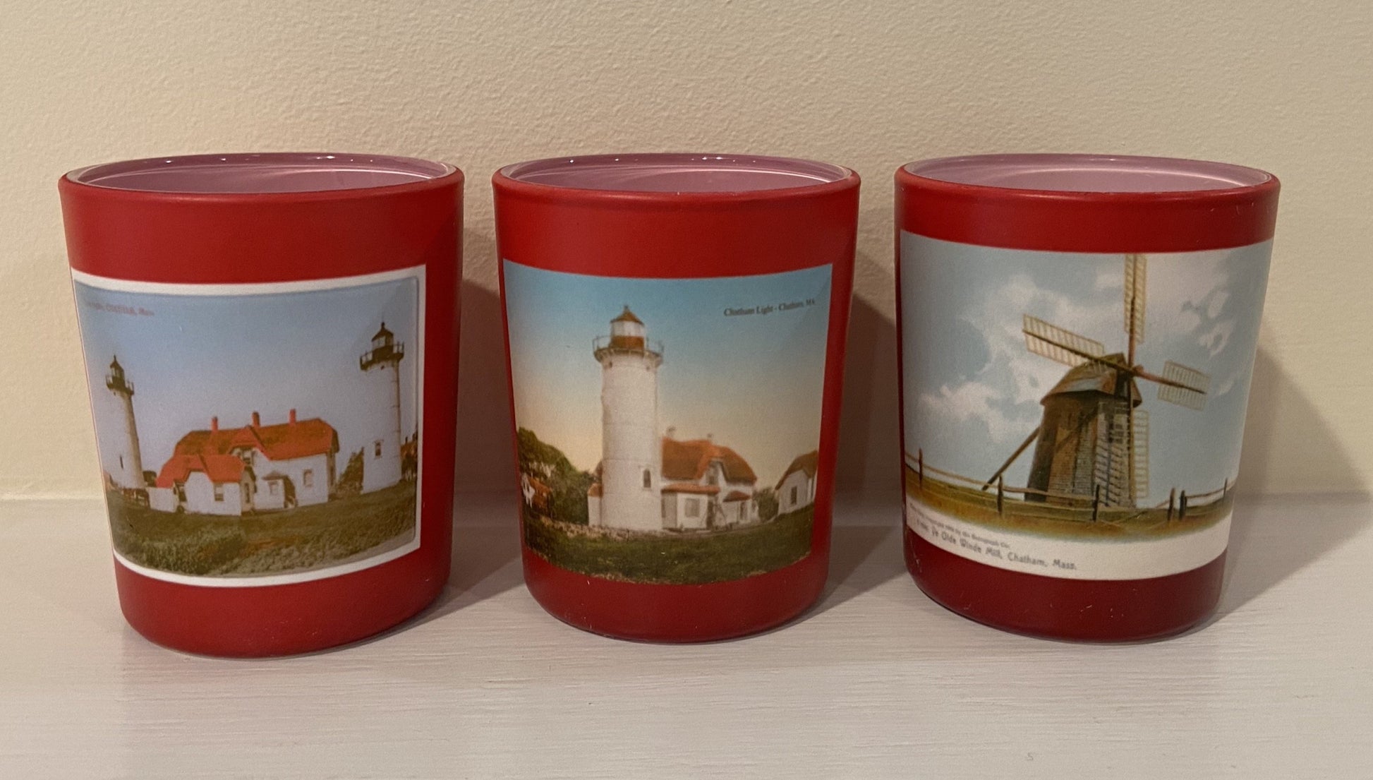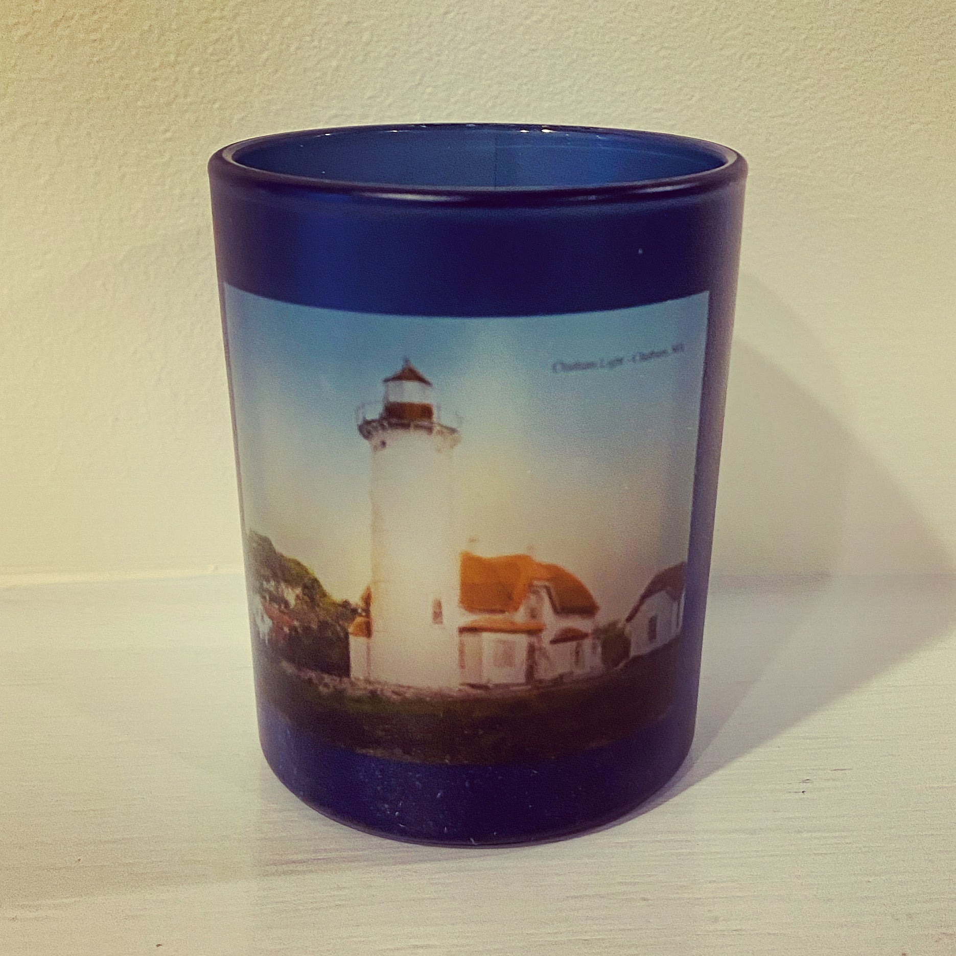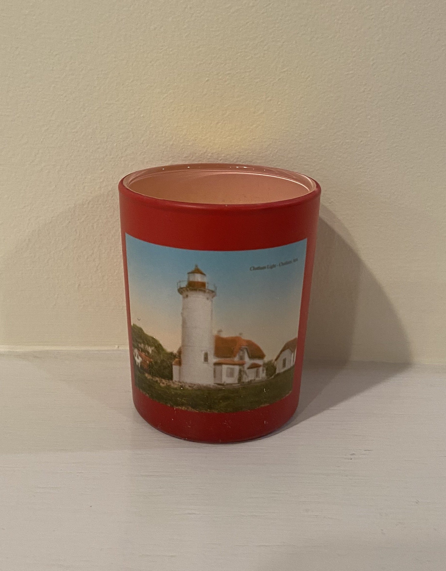 This glass tea light candle holder set features archival hand tinted postcard images of The Twin Lights of Chatham, Chatham Light and the town's iconic Wind Mill. Each is 2.75 inches high and is handmade in The UK. Whether lit with a real or electric tea light candle (as shown here) or unlit, it's a wonderful lighthouse design element or Cape Cod summer memento. They're sold in sets of 3 and arrive within 5-7 business days.