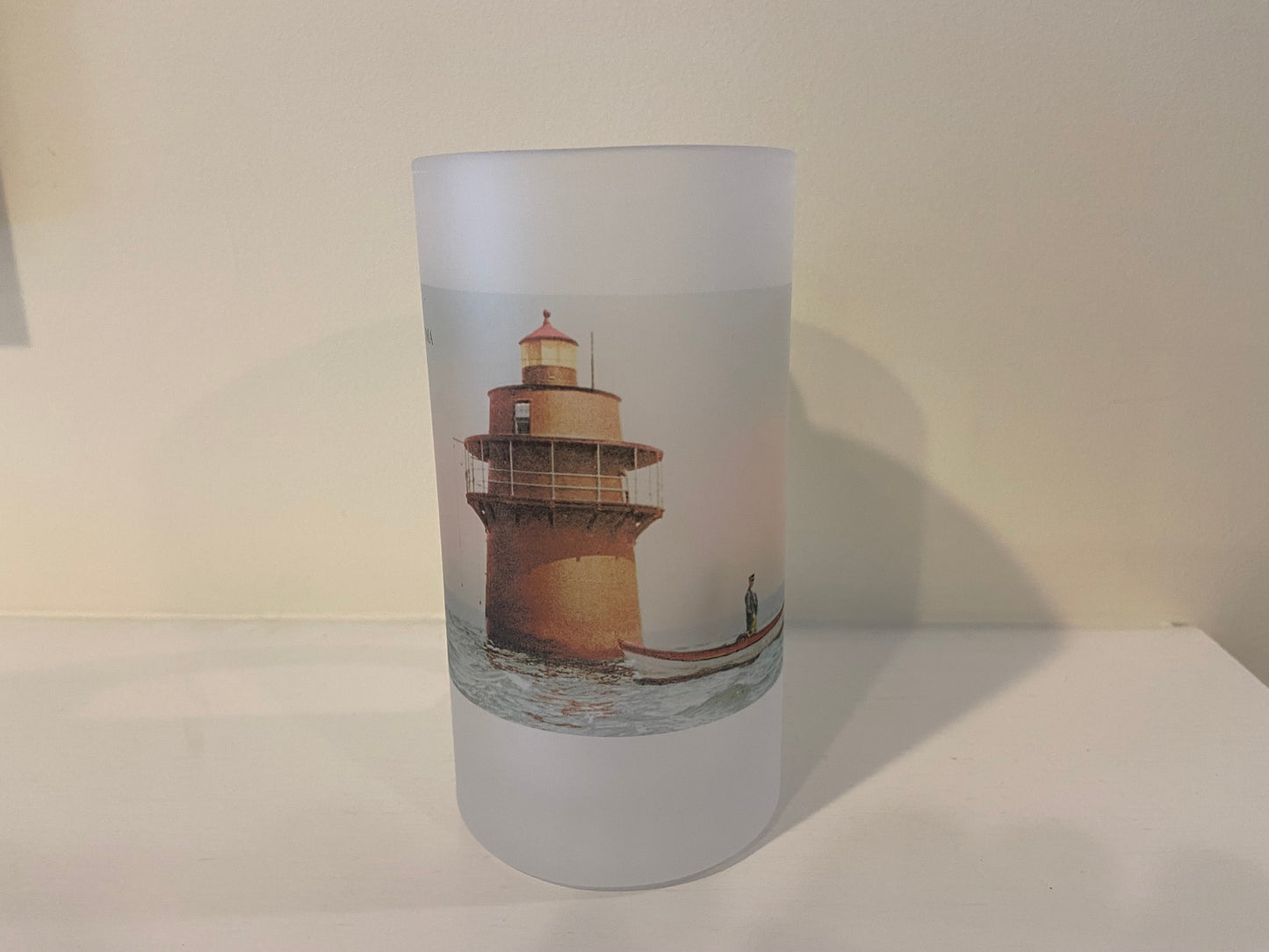 The brightly colored and fully functional beer mug feature's both the lighthouse and the keeper in a hand-tinted photo from over a century ago. Great working beer mug worn memento of anyone who grew up in the beautiful and historic town of Duxbury.
