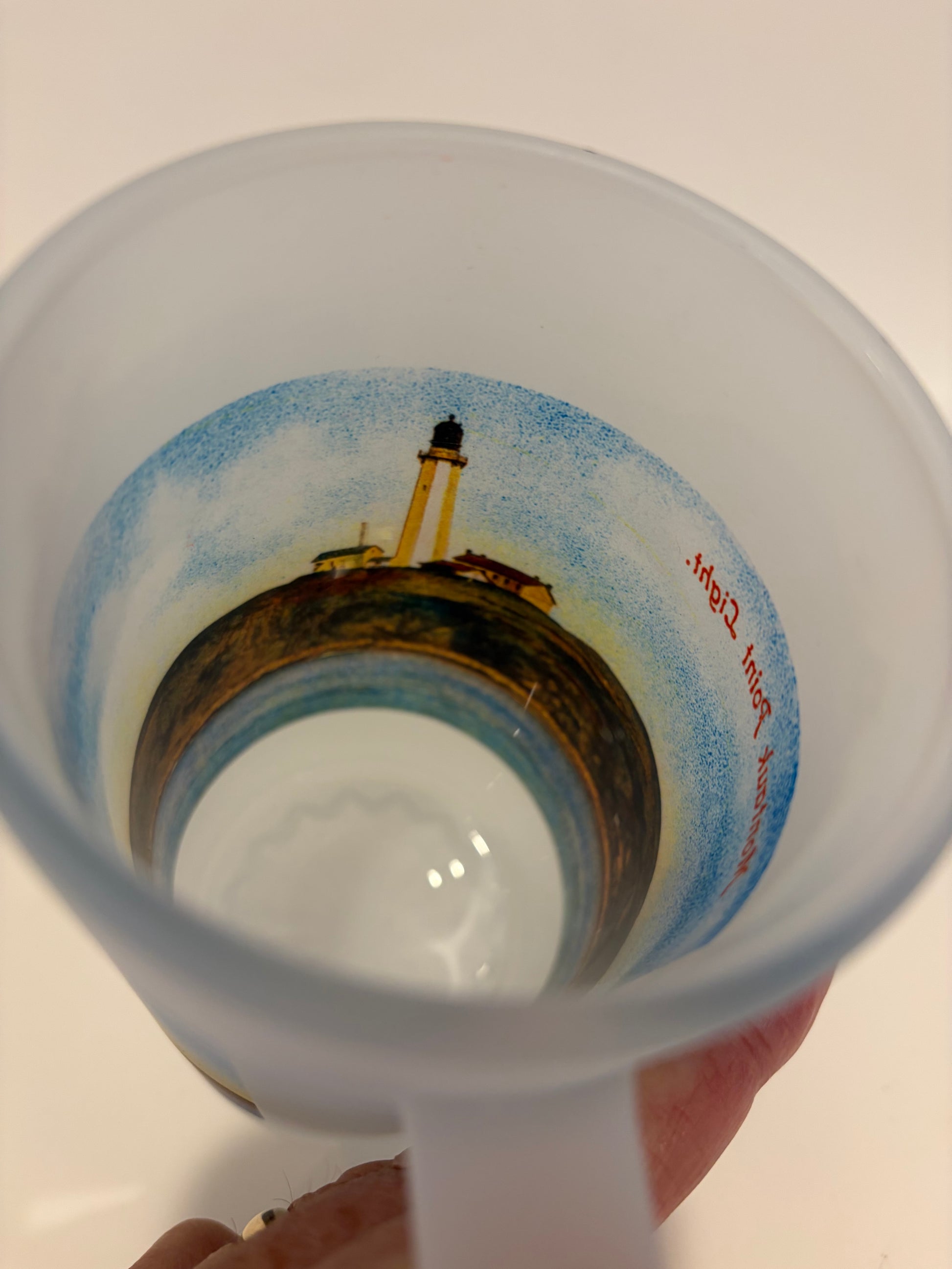 This colorful frosted glass mug of Montauk Light was created using a hand-colored photo postcard from approximately 1890 and shows the beacon before it featured its red stripe day marks.