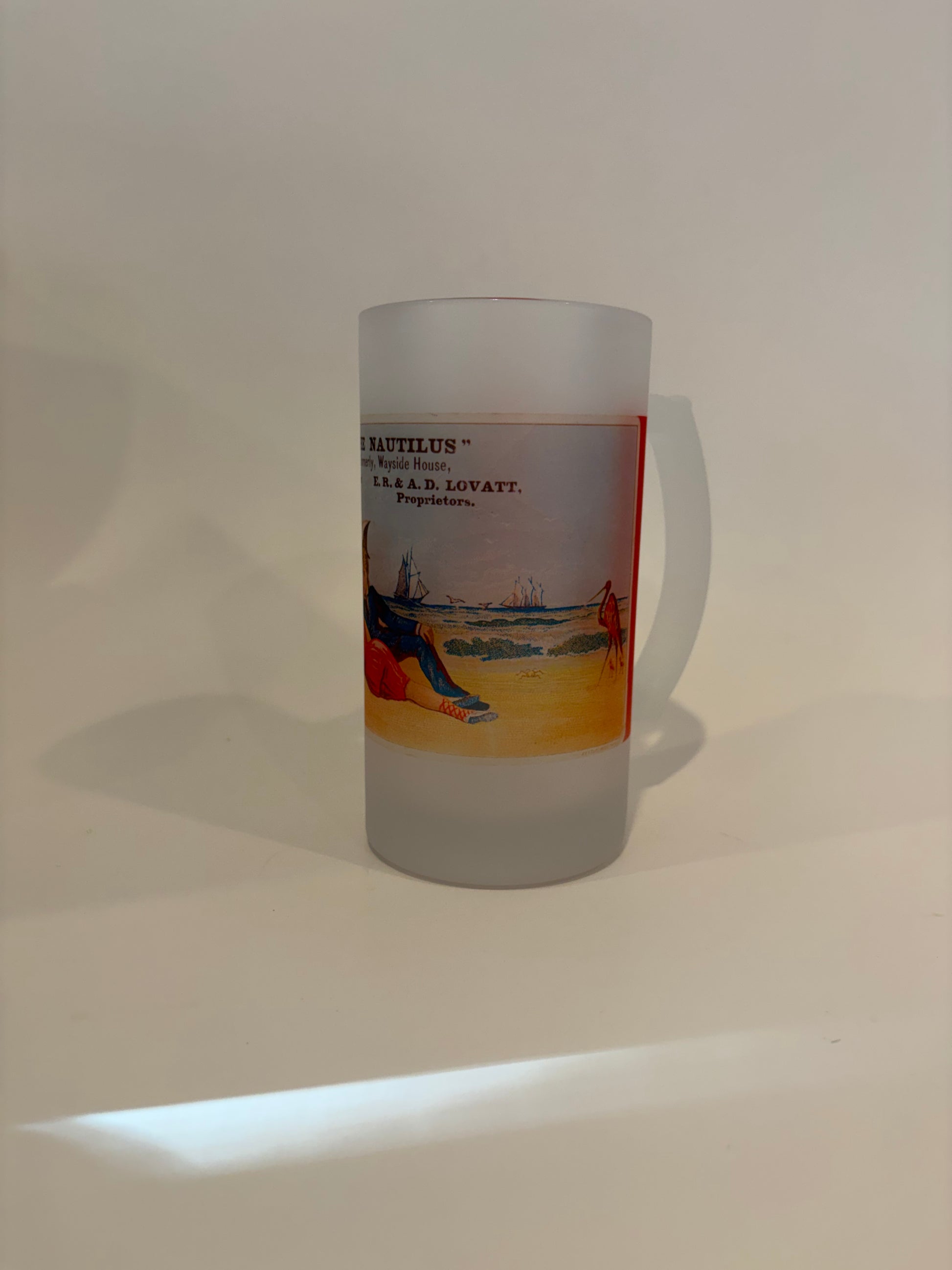 This frosted glass beer mug was created from a 19th Century trade card for The Hotel Nautilus in Nantasket Beach on Boston's South Shore. It was a welcome harbor for lonely sailors. Heavy duty and fully functional glass beer mug. Great out of the freezer.