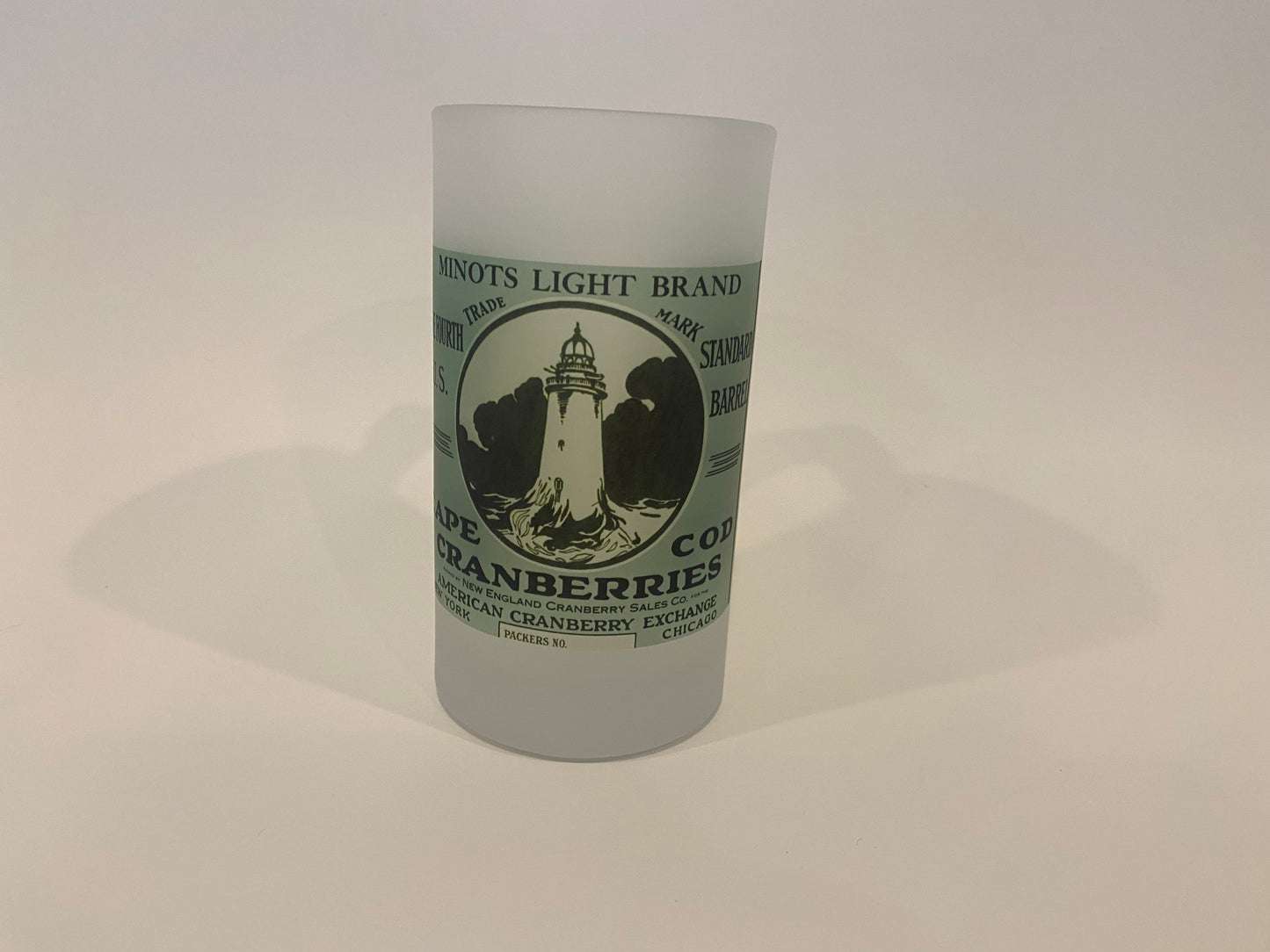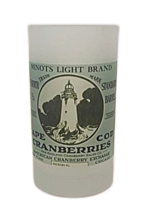 The heavy duty frosted glass beer mug features a beautiful design of Minot Light created from an antique cranberry crate label. Eye catching design in a fully functional beer stein.