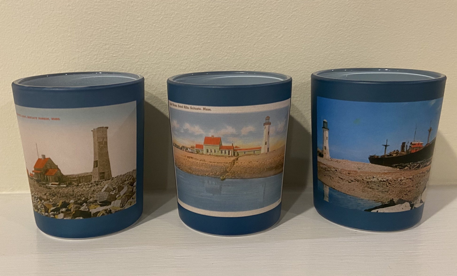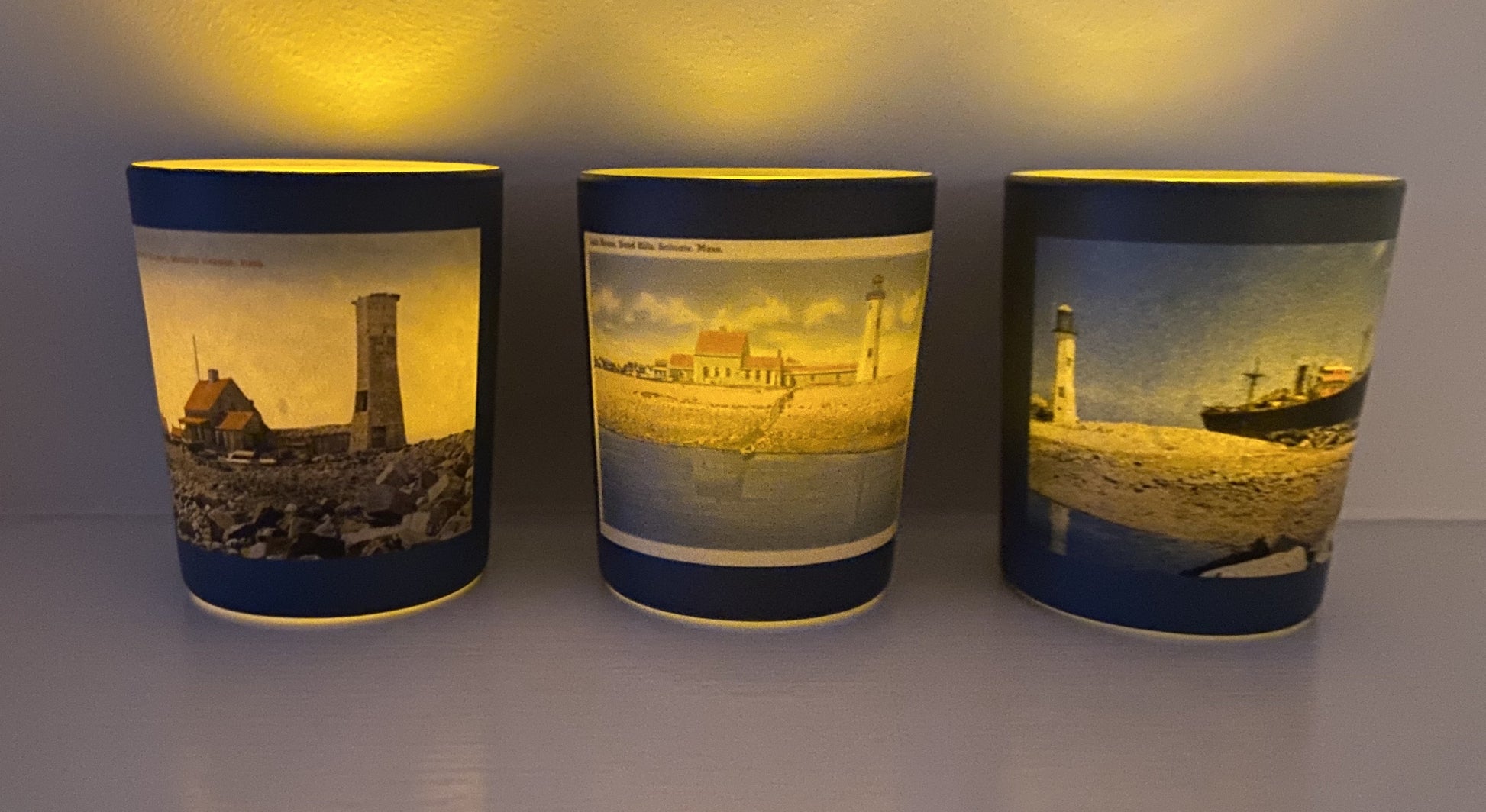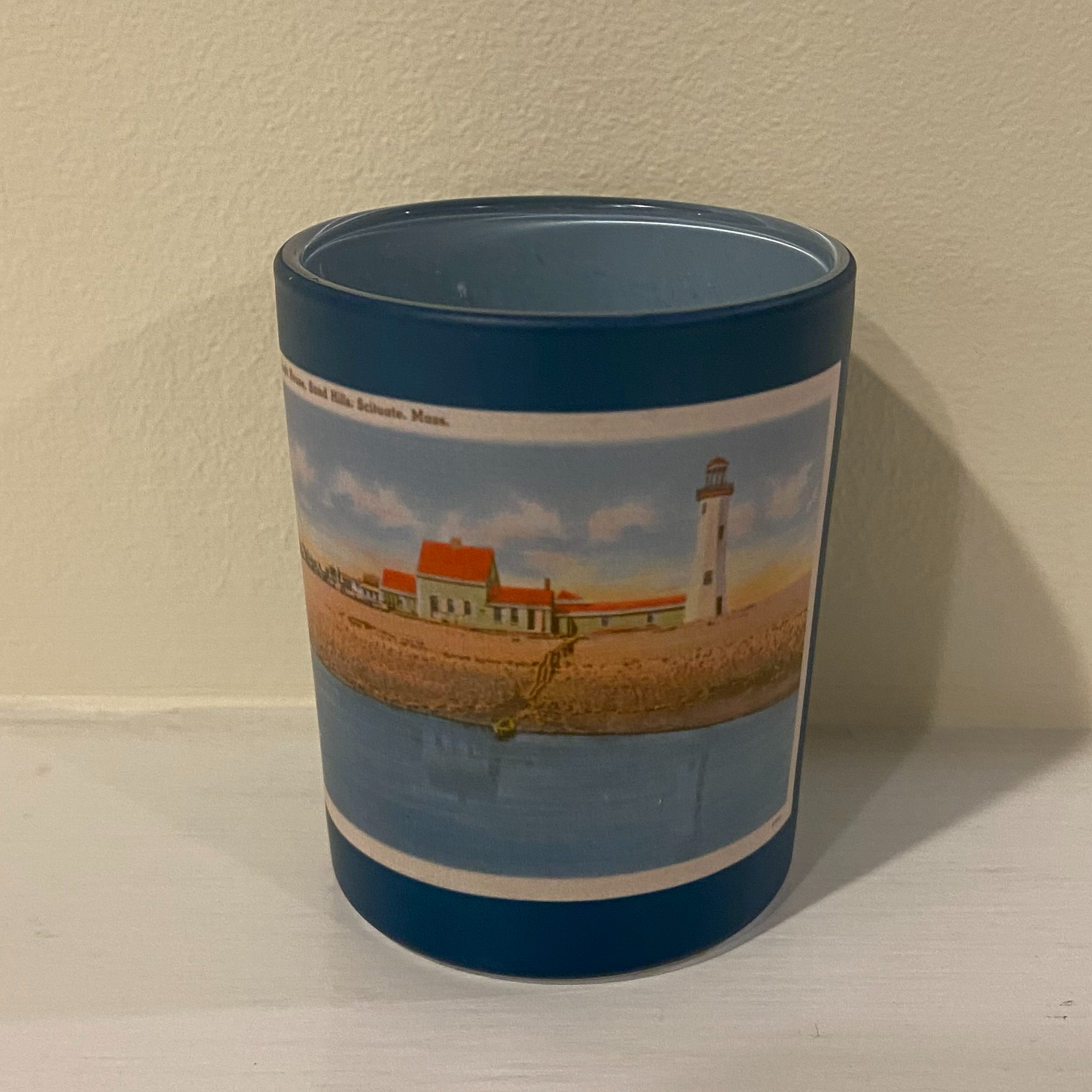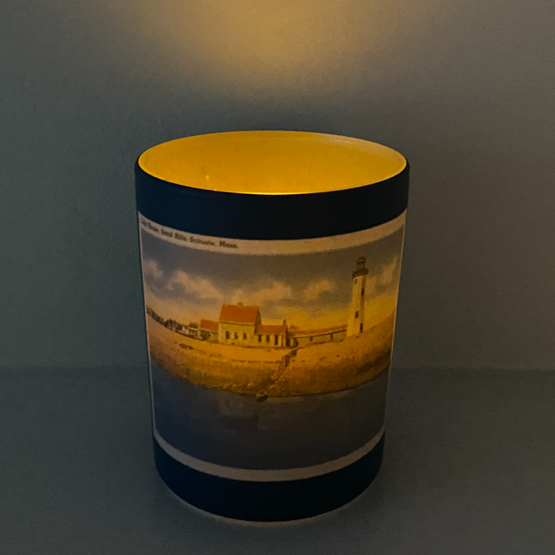 This glass tea light candle holder set features 3 brightly colored postcard images of Scituate Light in Scituate, MA and one features the Etruco which came ashore in the 1950s. East light is 2.75 inches high and is handmade in The UK. Whether lit with a real or electric tea light candle (as shown here) or unlit, they are a wonderful lighthouse design element or Scituate summer memento. They're sold in sets of 3 and arrive within 5-7 business days.