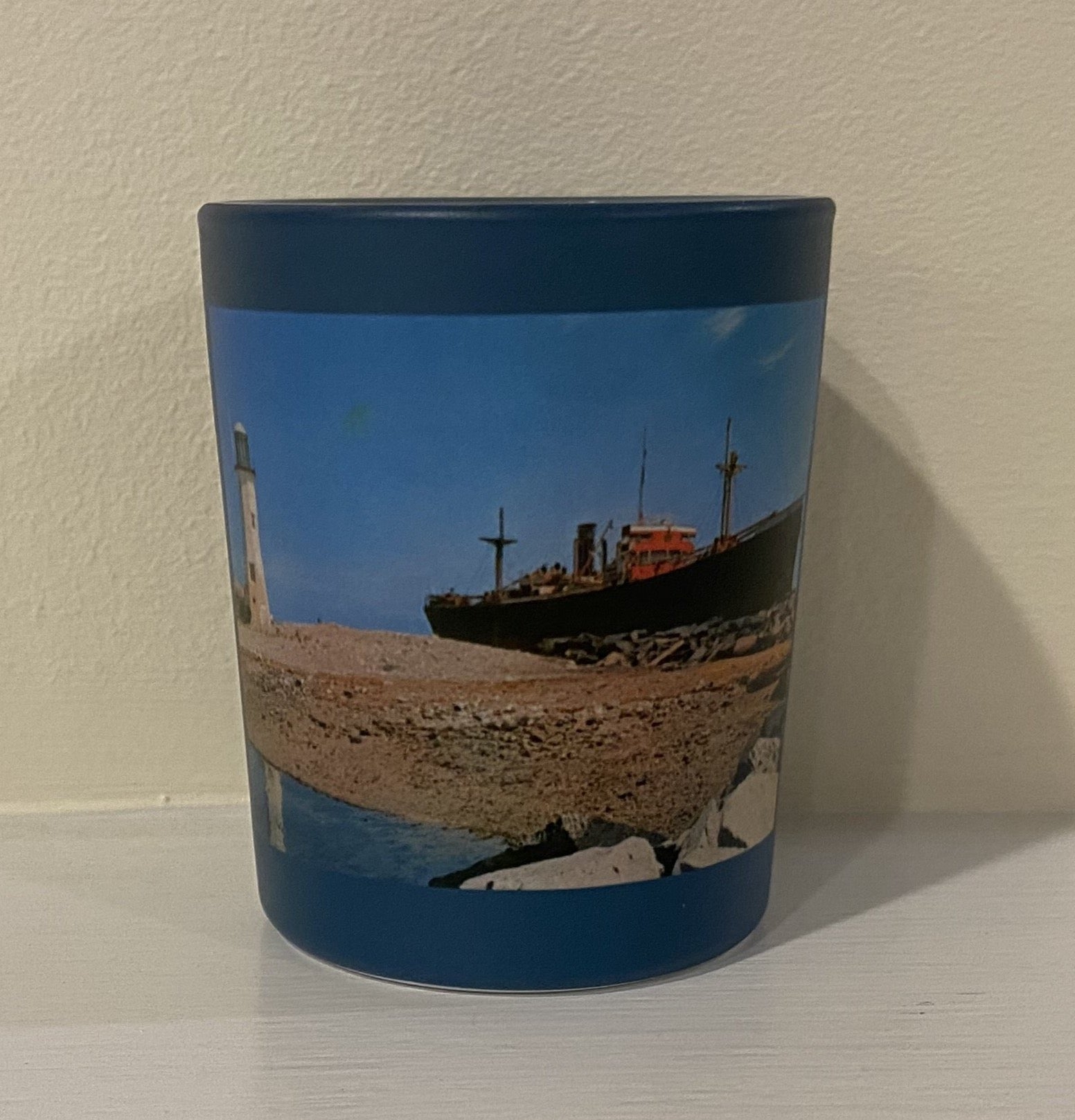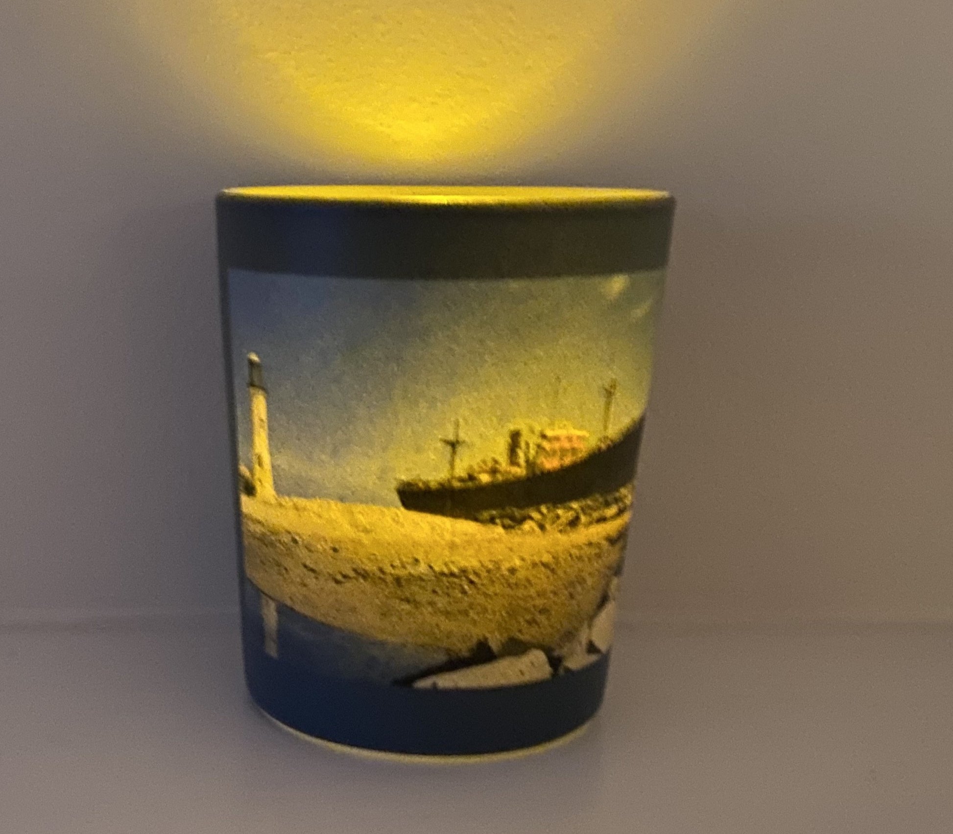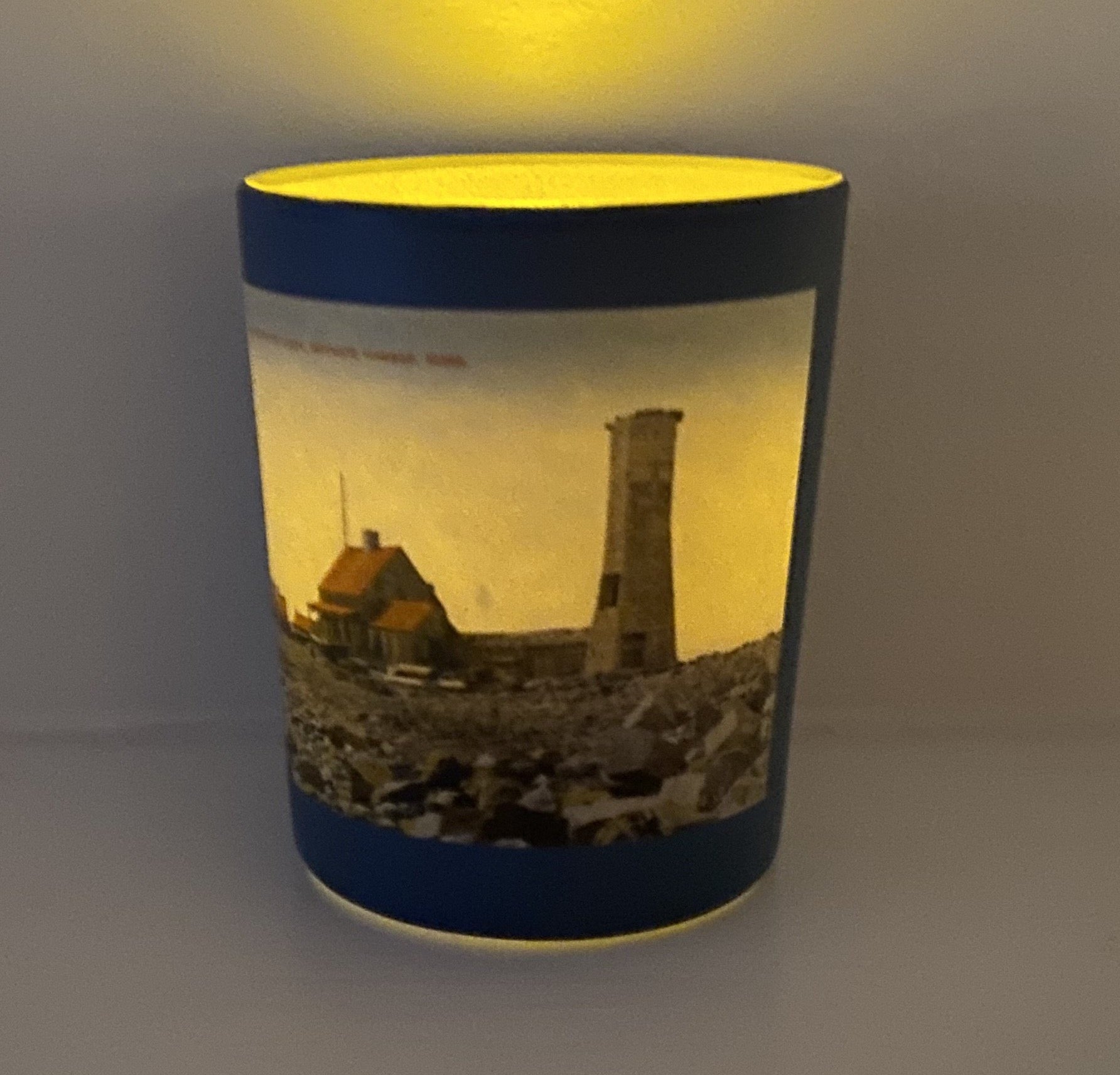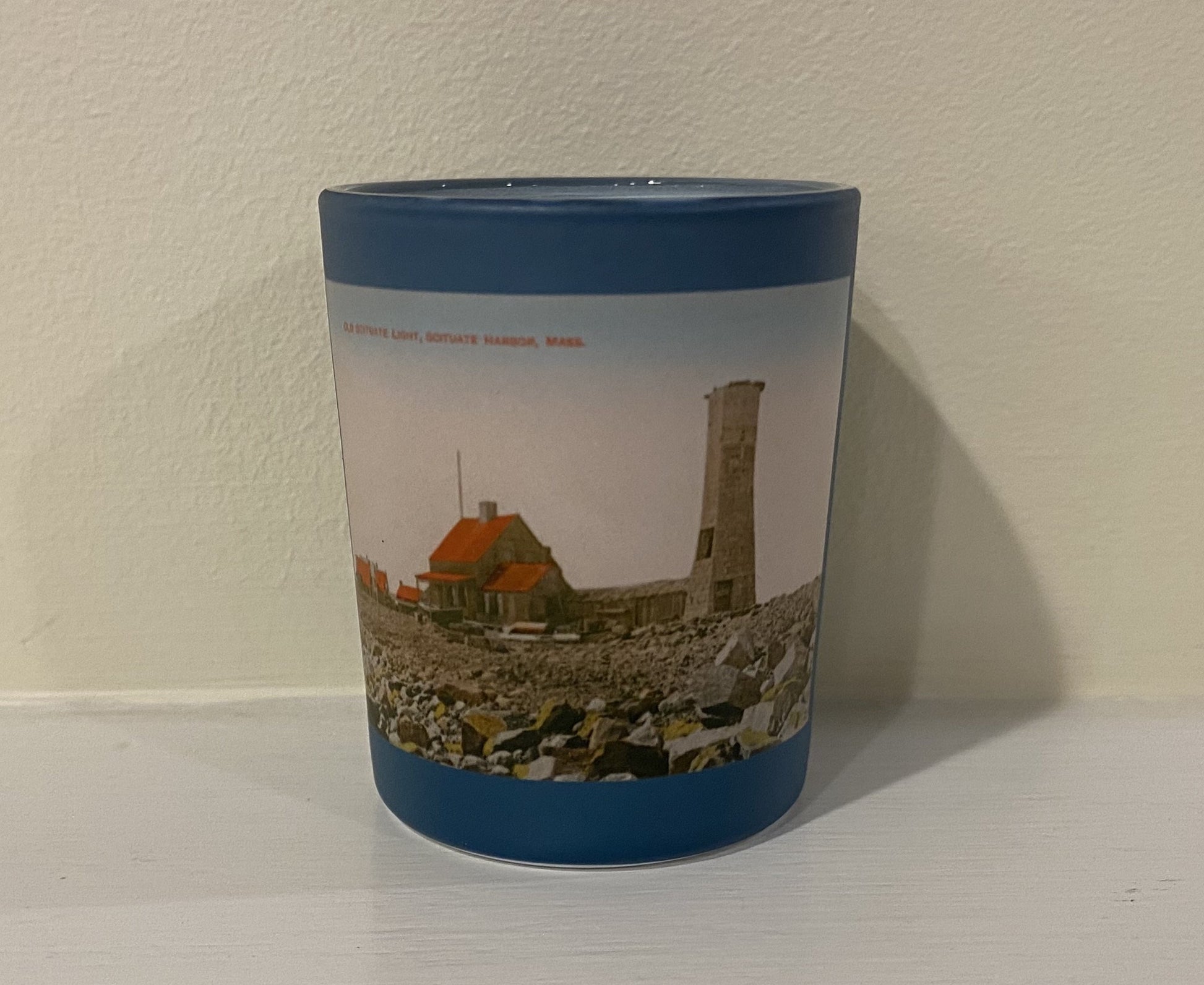 This glass tea light candle holder set features 3 brightly colored postcard images of Scituate Light in Scituate, MA and one features the Etruco which came ashore in the 1950s. East light is 2.75 inches high and is handmade in The UK. Whether lit with a real or electric tea light candle (as shown here) or unlit, they are a wonderful lighthouse design element or Scituate summer memento. They're sold in sets of 3 and arrive within 5-7 business days.