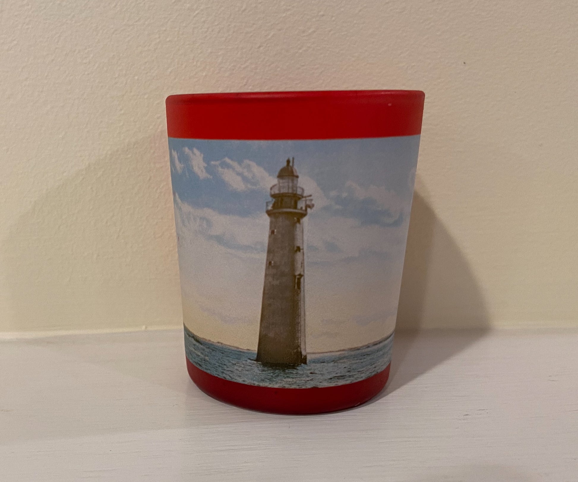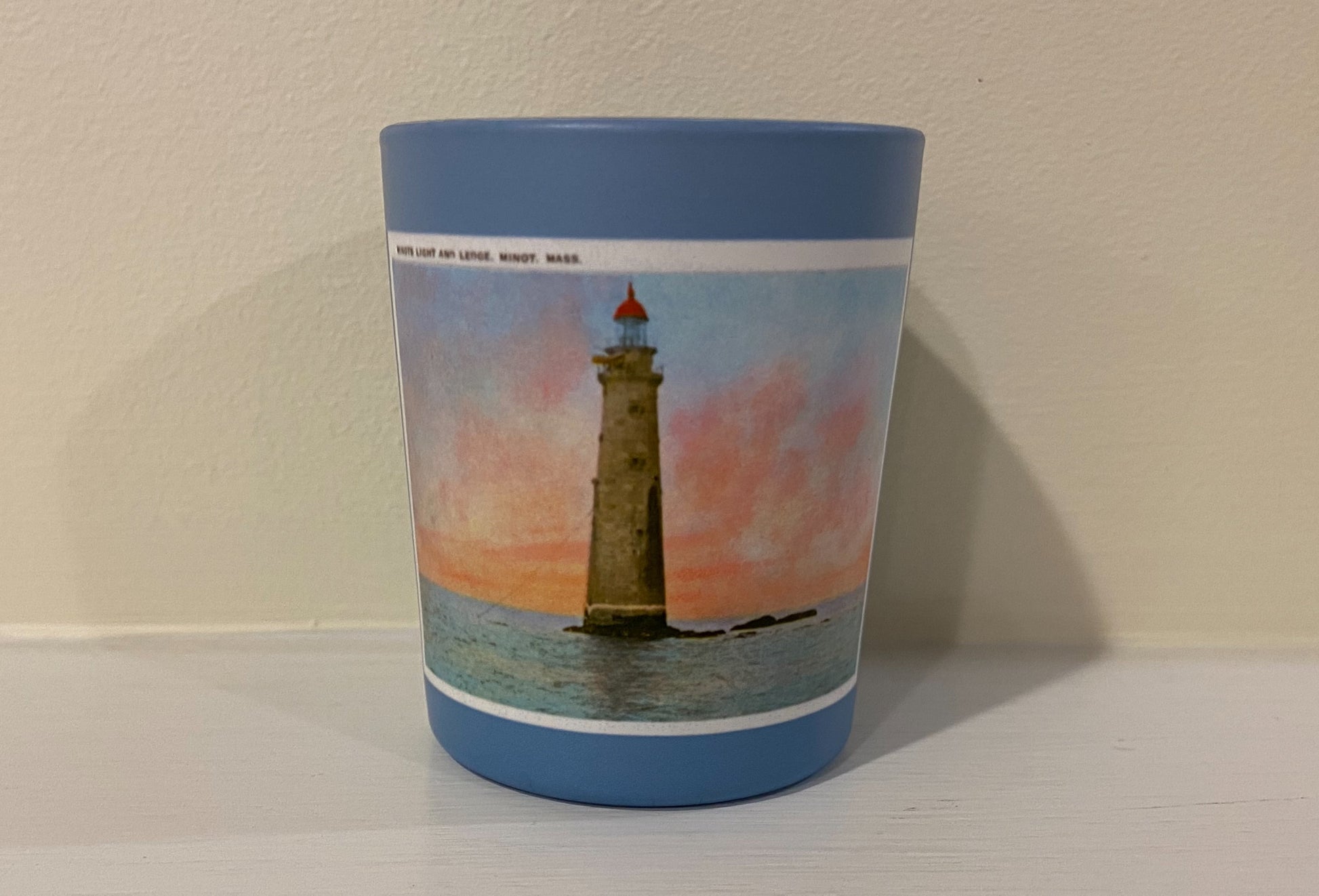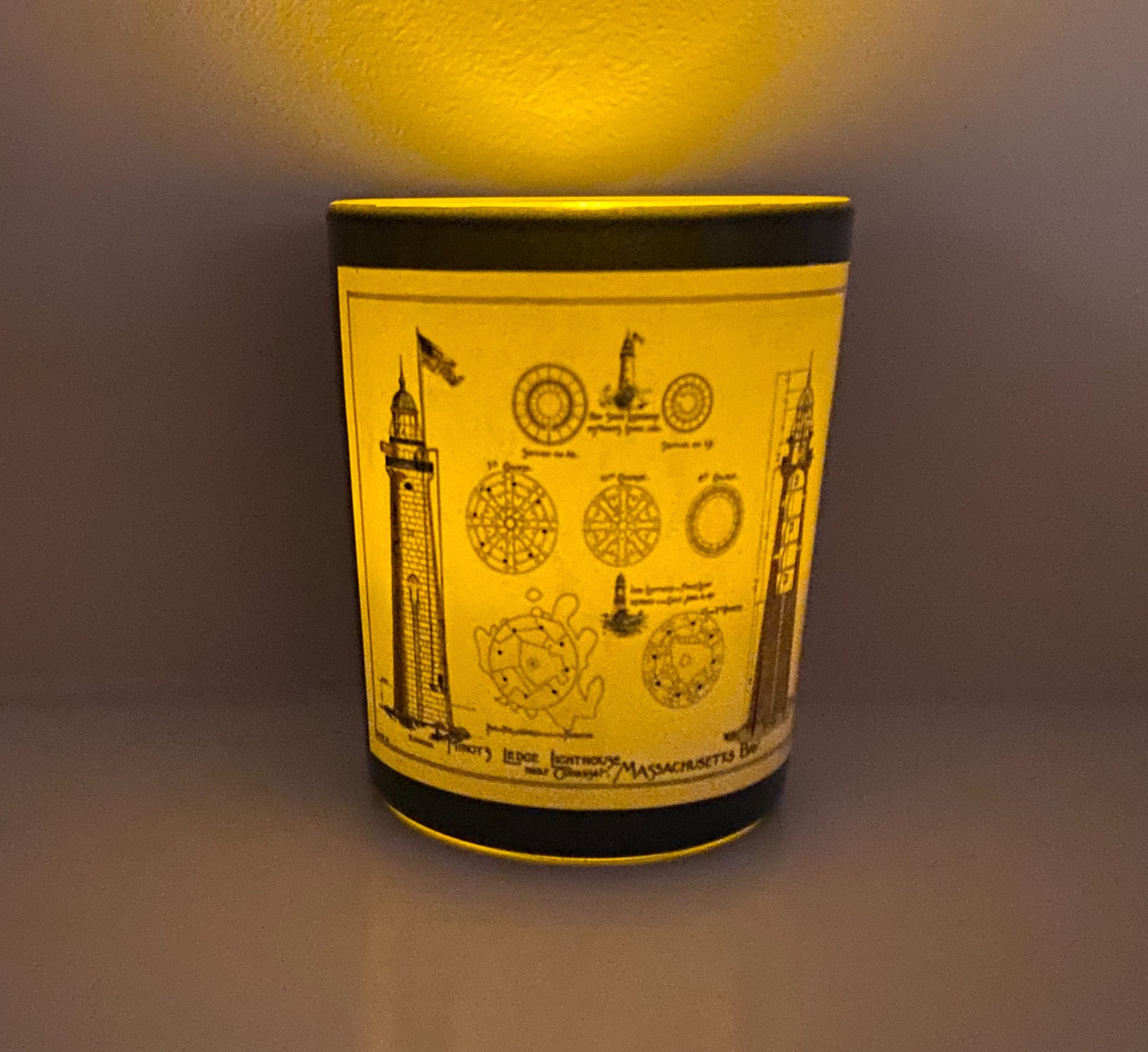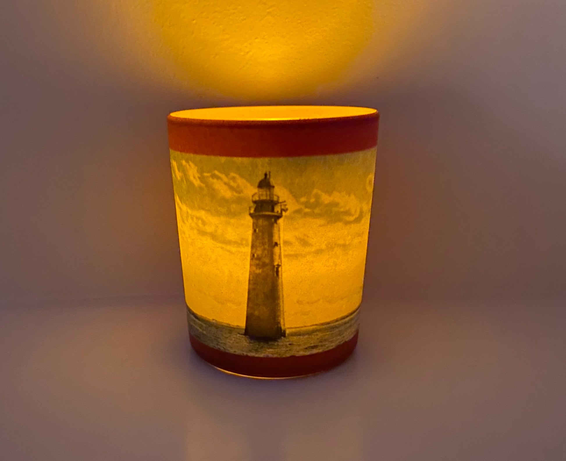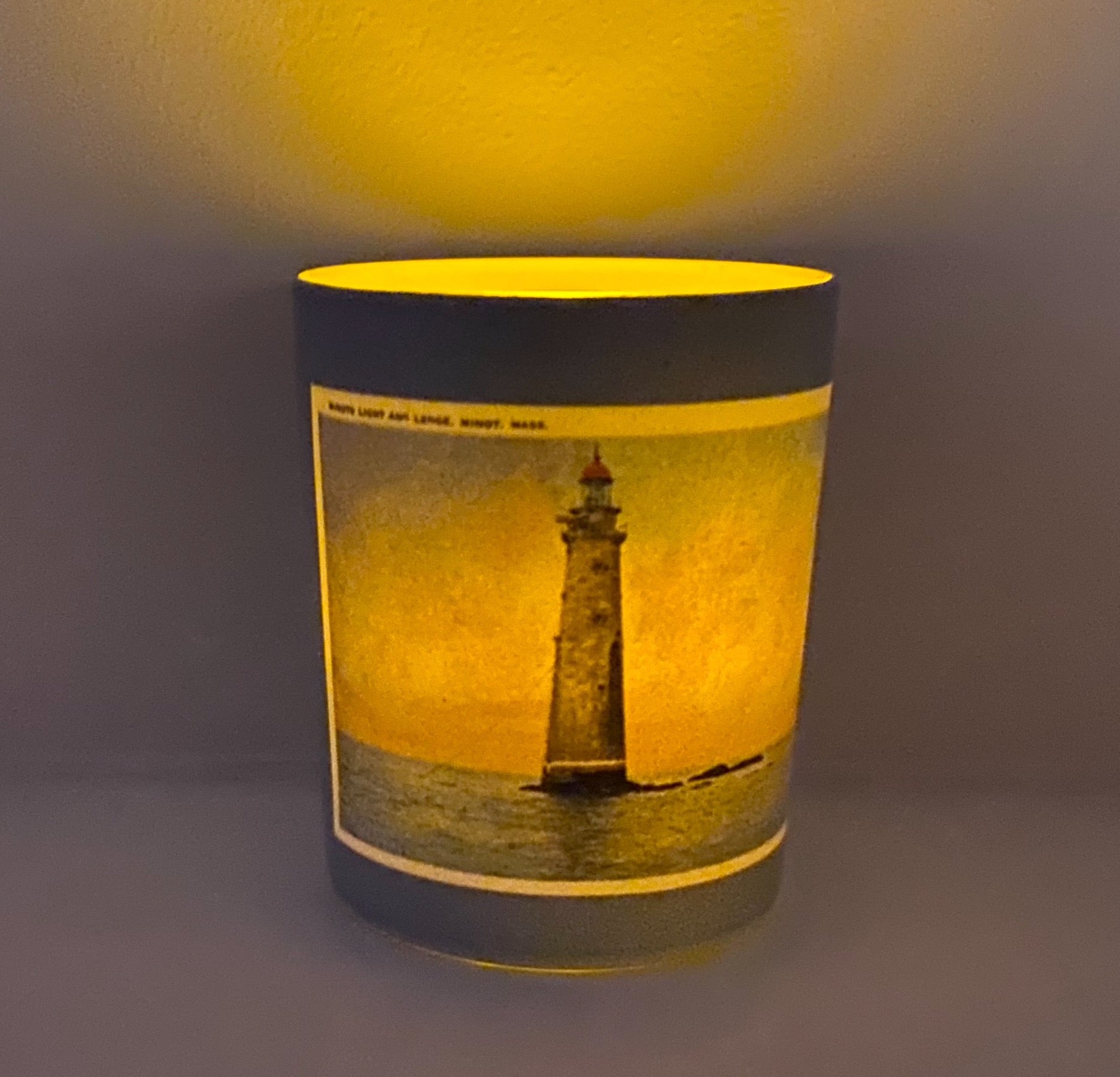 This glass tea light candle holder set features Archival hand-tinted postcard images of 3 images of Minot's Light off the coast of Massachusetts. Each is 2.75 inches high and is handmade in The UK. Whether lit with a real or electric tea light candle (as shown in some photos here) or unlit, each is a wonderful lighthouse design element or table top focal point. They're sold in sets of 3 and arrive within 5-7 business days.
